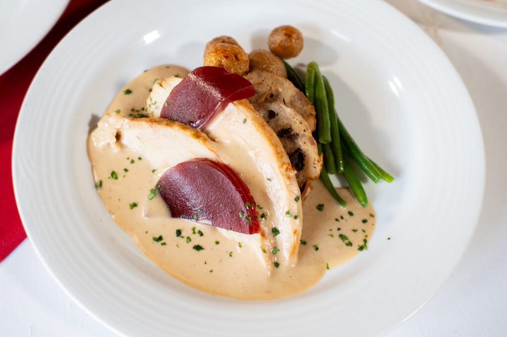 El Menú Navideño 2025 rinde homenaje a la mesa familiar con un recorrido de sabores que combinan tradición y toques contemporáneos. La velada inicia con un carpaccio de remolacha ahumada con aderezo de melocotón, esferas de quesos finos y alcachofa, sigue con una crema de almendra con espárragos y juliana de jamón serrano, continúa con el clásico pavo navideño con relleno californiano y jalea de arándanos y culmina con una tartaleta de higos al vino tinto, símbolo de abundancia y buena fortuna.