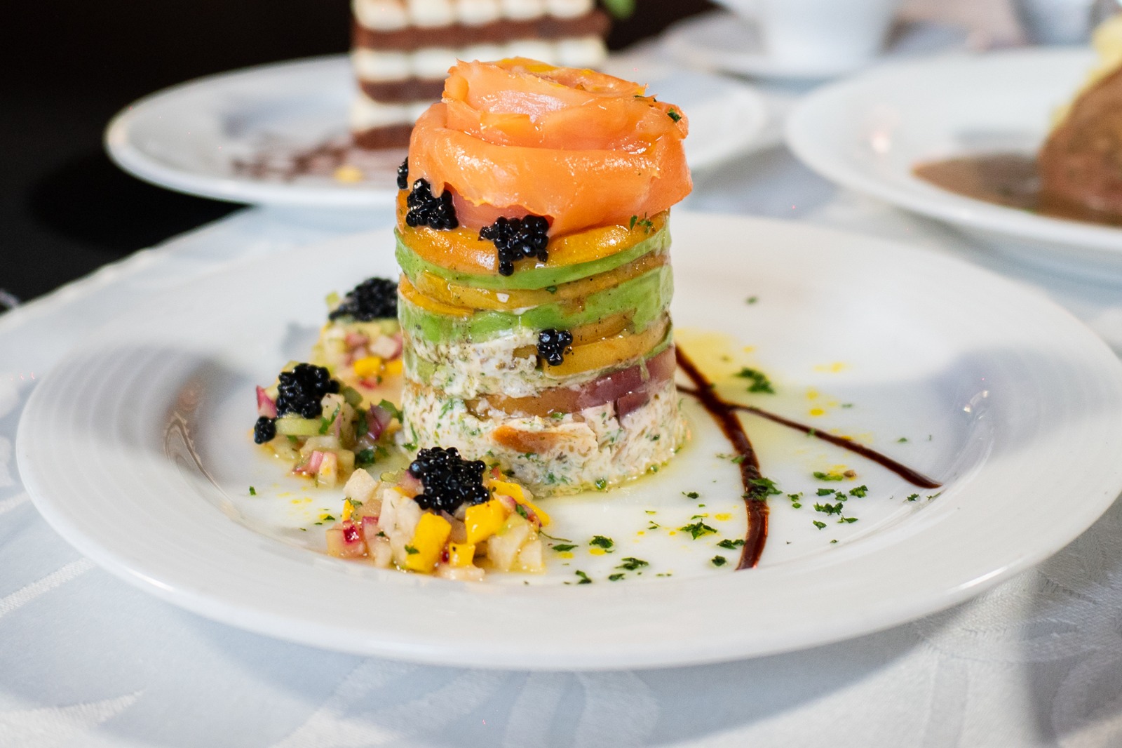 El Menú de Año Nuevo 2025-2026 inicia con un gravlax de salmón perfumado al Pernod, seguido de una crema de morillas perfumada al cognac, dos preparaciones ligadas al lujo gastronómico y a la idea de avanzar sin retroceder. Como plato fuerte se sirve un filete de res con salsa a las tres pimientas sobre puré de papa rústica y terrina de vegetales, y el final dulce llega con un brownie con esencia de tiramisú y una compota de queso mascarpone con frutos rojos, pensados como símbolos de dulzura y renovación.