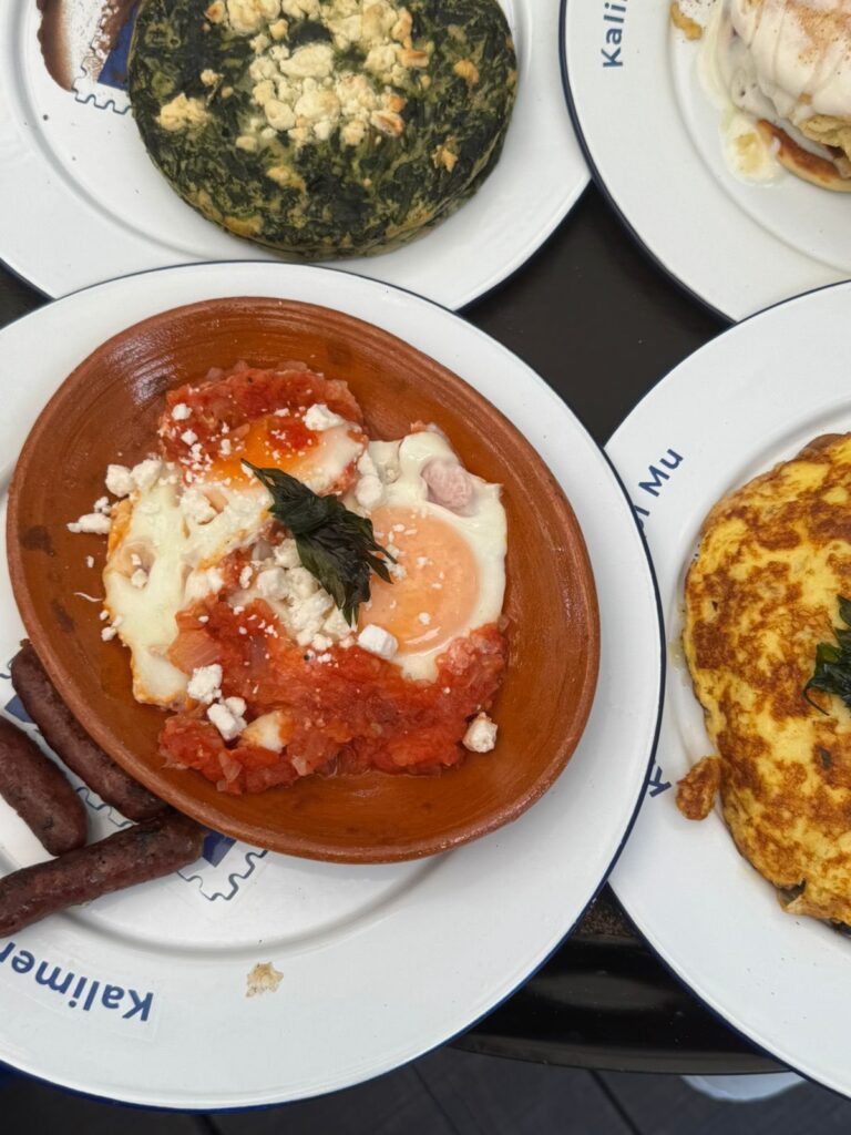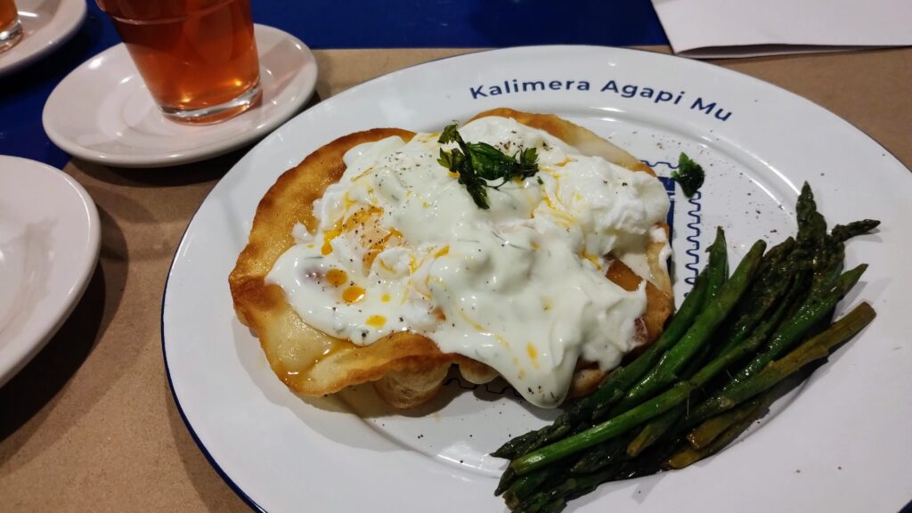 La carta es cortita pero tiene cosas sabrosas, mediterráneas todas, como los huevos Afgá Kaliméra, son un par de huevos pochados sobre un pan pita delgadito y dorado, aderezado con salsa de yogur y con una guarnición de espárragos, receta ligera. Por el estilo, los huevos Mesogiakó, la versión griega de una receta muy clásica de los huevos mediterráneos en cazuela con salsa de jitomate fresco y queso feta.