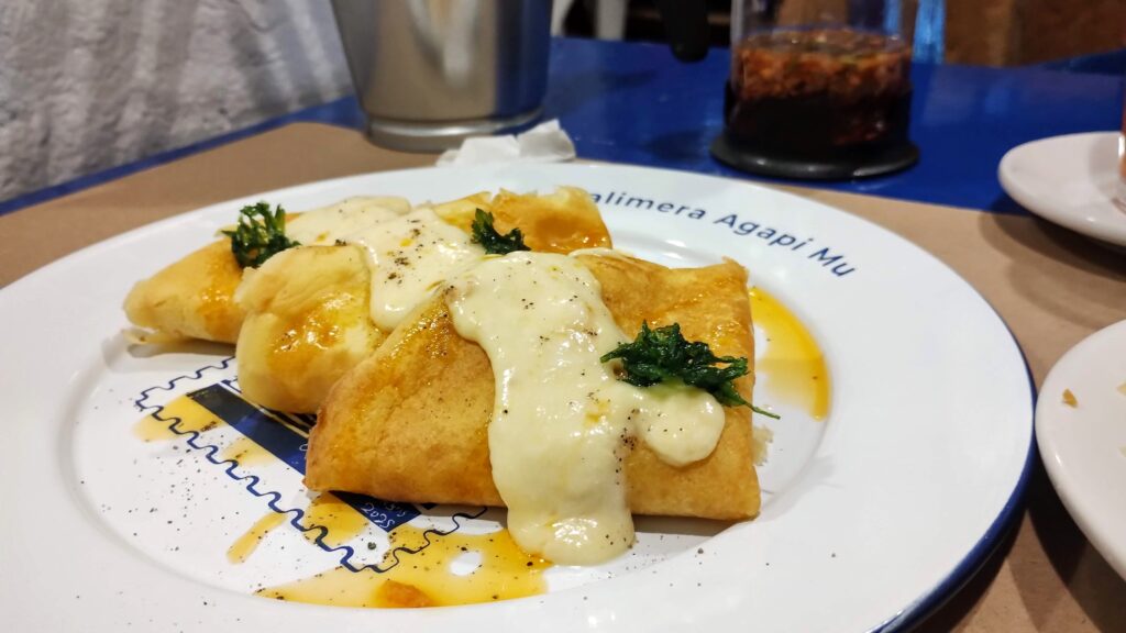 Nuestras favoritas, las Crepas Kotópulo, que es una receta regional con la que se guisa el pollo con berenjena y yogur griego, mucho sabor, bastante sabroso.