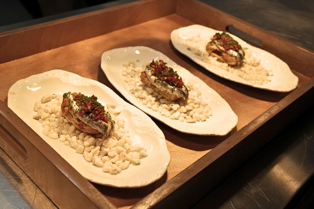 Para picar hay opciones ricas, típicas, como la gilda con boquerones del Cantábrico, dados de atún en escabeche; las croquetas de ibérico; buñuelos de bacalao a la catalana; pintxos variados y hasta tortilla de patata, con cebolla, por si estabas con la duda. Hasta cosas tan sencillas como un plato de huevos rotos, que aquí se pueden hacer con camarones, o con puntas de solomillo Wagyu al ajillo, o más clásicos, con morcilla de Burgos. Platos sencillos donde usan huevos de libre pastoreo, patatas perfectas y aceite de oliva extra virgen de calidad.